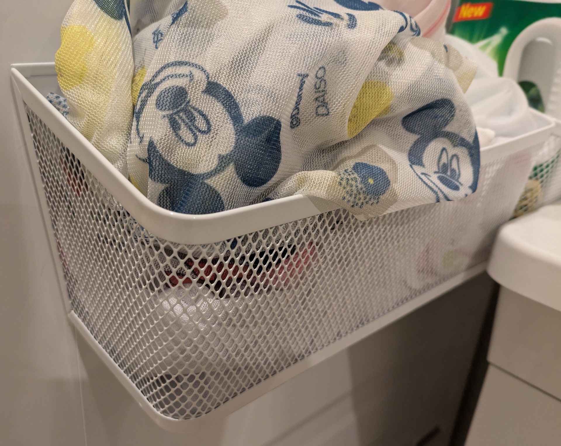 そのため、こちらのマグネットの収納を購入して、洗濯機の横にくっつけて、洗剤などを置いています。