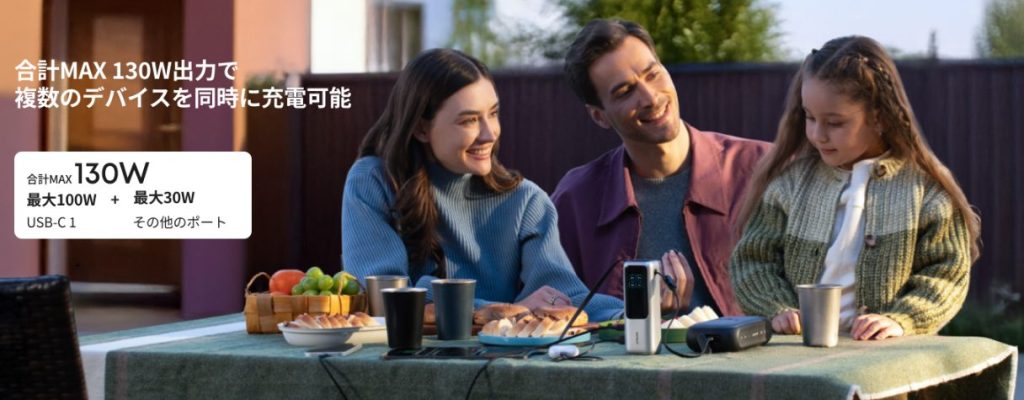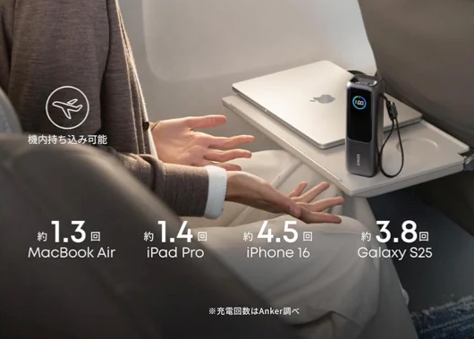 また、最大100Wで充電した場合、「iPhone16」なら約25分、「MacBook Air」なら約33分で0%から50%まで充電できます。