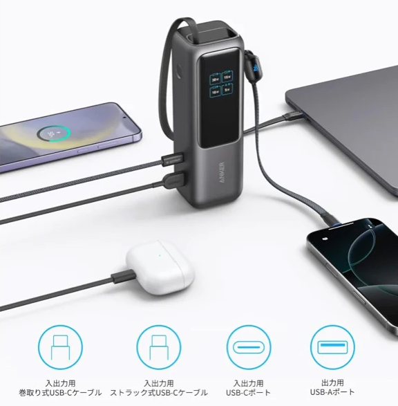 【新製品】スマホにPC全部OK!Anker巻取り式USB-Cケーブル一体型モバイルバッテリー【旅行や出張に最適】