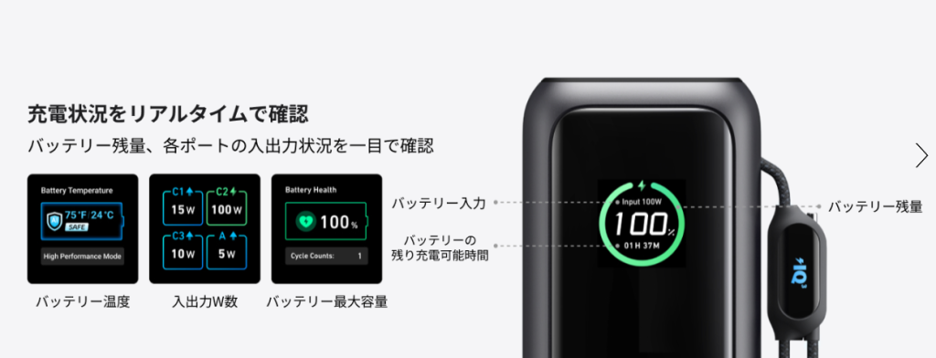 さらに、モバイルバッテリー本体の充電も最大100Wで可能で、約100分でフル充電が可能です。