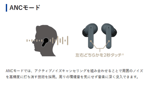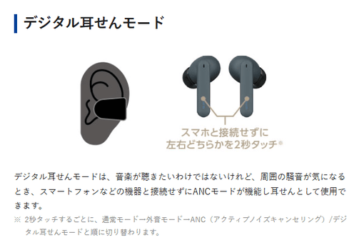 - 音楽を聴かずにANC(アクティブノイズキャンセリング)機能を使って、耳栓として使用できるモードです。