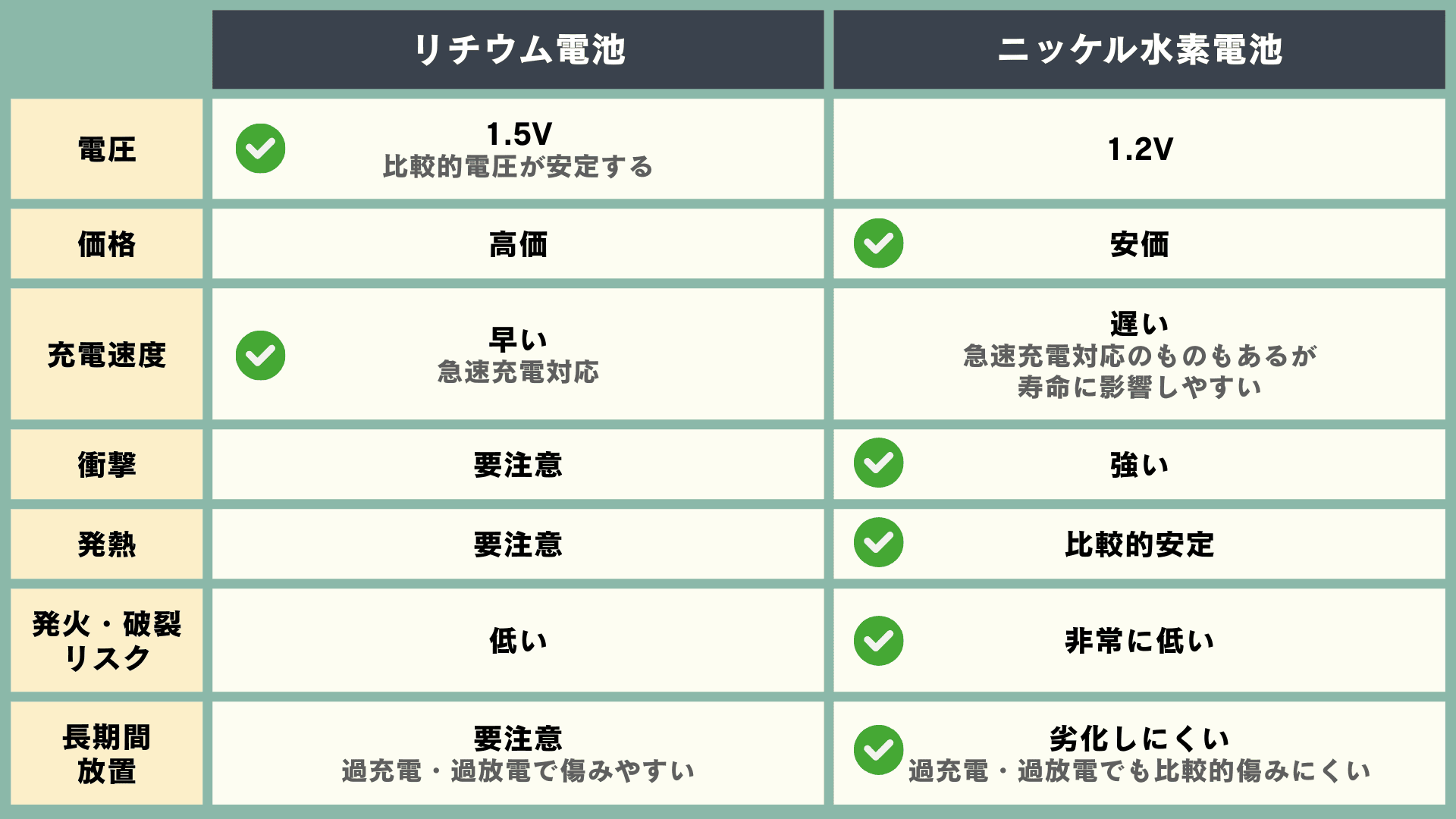 リチウム電池とニッケル水素電池の違いはこちらの表のとおり。