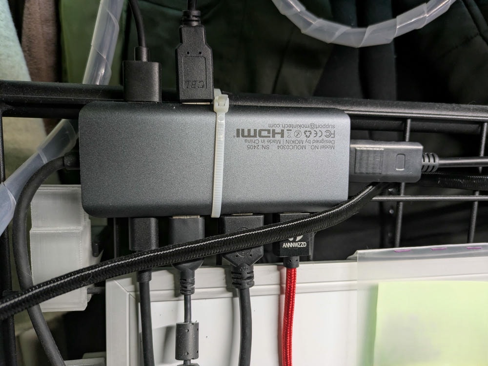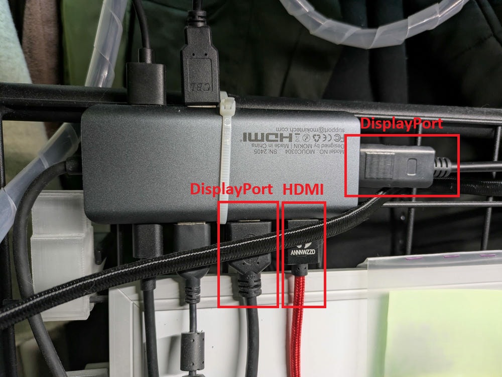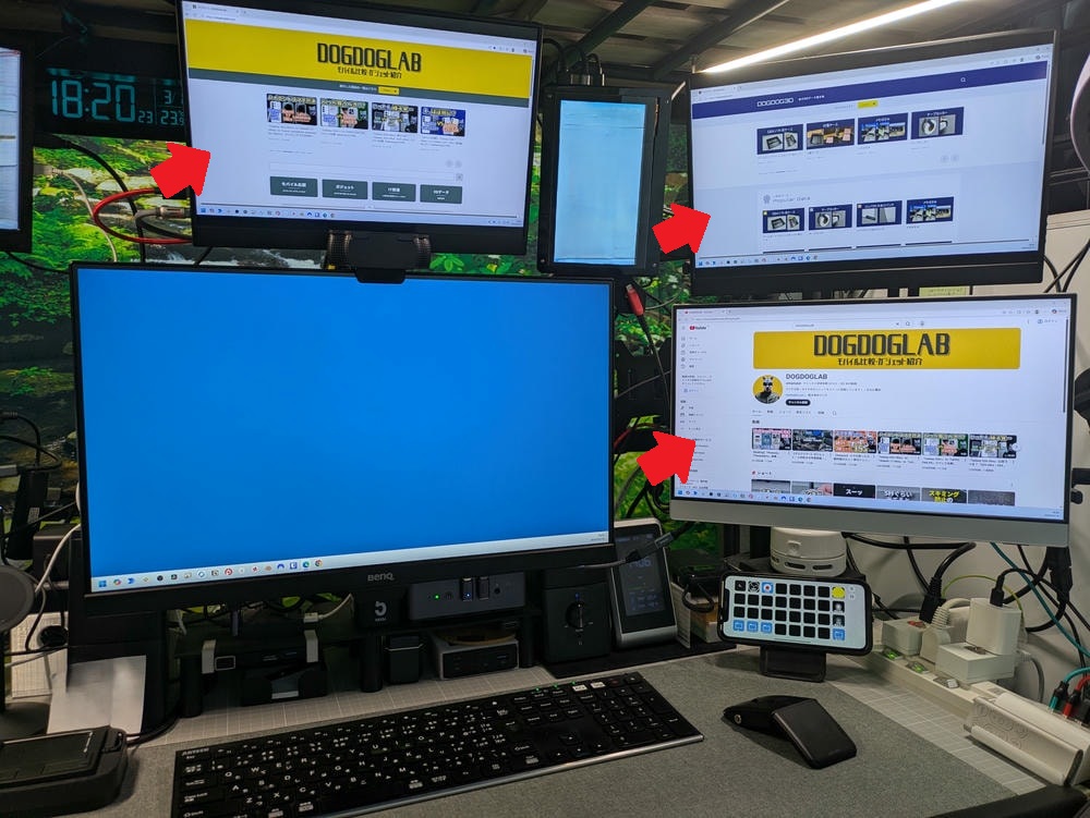 この環境、どのように構築しているのかというと、画像の赤矢印の3つのディスプレイについては、HDMIやDisplayPort、USBなどを接続できる多機能ハブを使用しています。