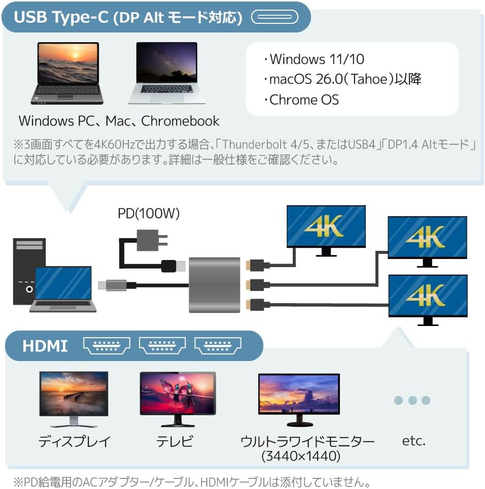 - USB Type-CからHDMIで3台のディスプレイに簡単出力