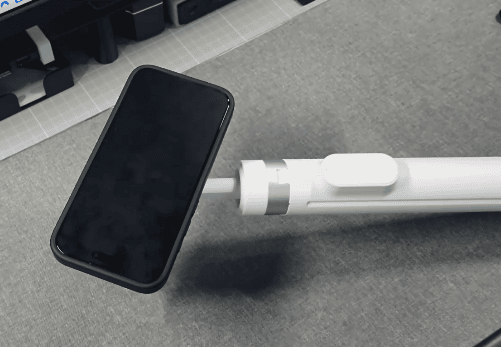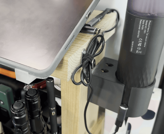 ちなみに私は、ハンディクリーナー置き場を3Dプリンターで自作して、机の横に置けるようにしています。充電部分が出るように設計。