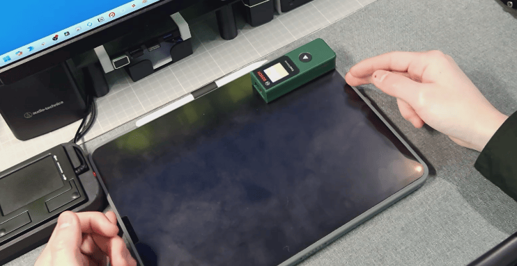 地味な使い方ですが、例えばこのiPadの幅を知りたい時、角のところにiPadを当てて、レーザー距離計を角に揃えることで、簡単に測定できたりもします。