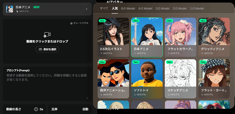動画から動画生成では、元動画をアニメ風やイラスト風など、様々なスタイルに変換できます。