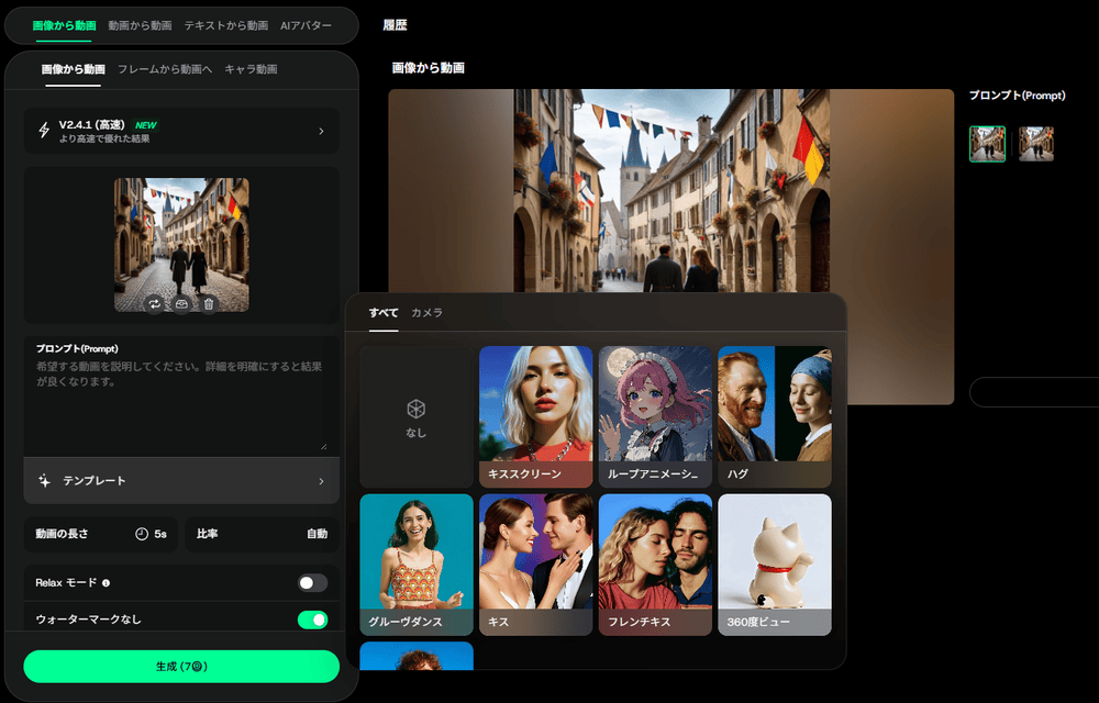 また、どのように動かしたいか、プロンプトを入力して指示することも可能ですし、「ハグ」や「グルーヴダンス」「360度ビュー」などのテンプレートも用意されています。