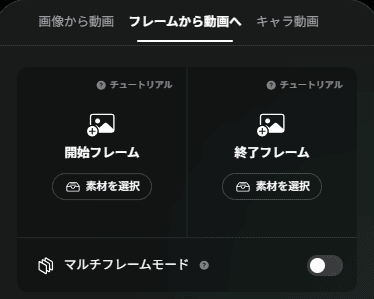 フレームから動画生成は、2枚~8枚の画像をアップロードすることで、各フレーム間をスムーズにつないだ動画を生成できます。