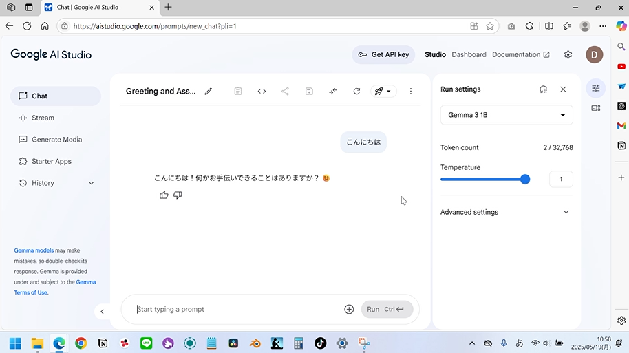 例えば「Gemma」を選択して、「こんにちは」と入力すると、こんな感じに返答が返ってきます。