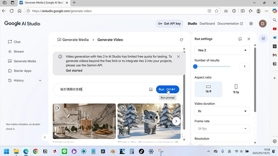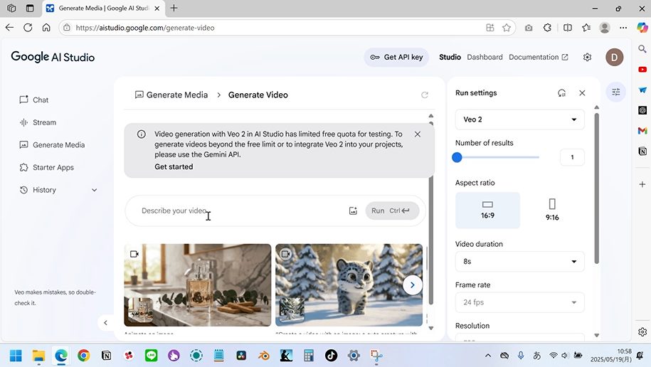 注意点として、「Google AI Studio」で「Veo2」を無料で使う場合、生成できる動画の数に制限があります。