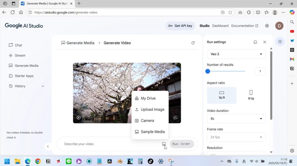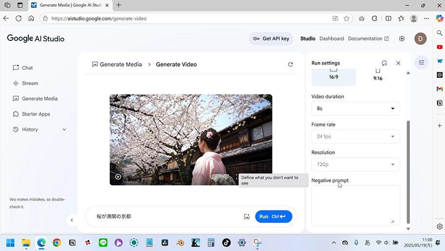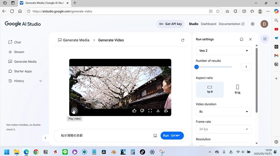 桜が満開の京都の動画を作るには、ここの入力欄に、「桜が満開の京都」と入力し、「Run」をクリックするだけになります。