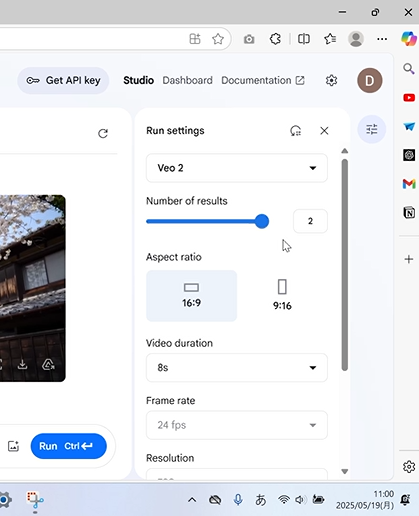 生成する動画の数は1個か2個、アスペクト比は16:9か9:16、秒数は5~8秒を選ぶことができます。