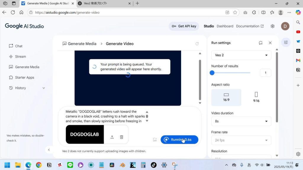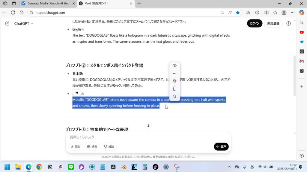 入力欄に、「Veo2で8秒の動画を生成しようと思います。アップロードする「DOGDOGLAB」という文字をかっこよく動かすプロンプト(日本語と英語)を3つ考えてください。」と入力します。