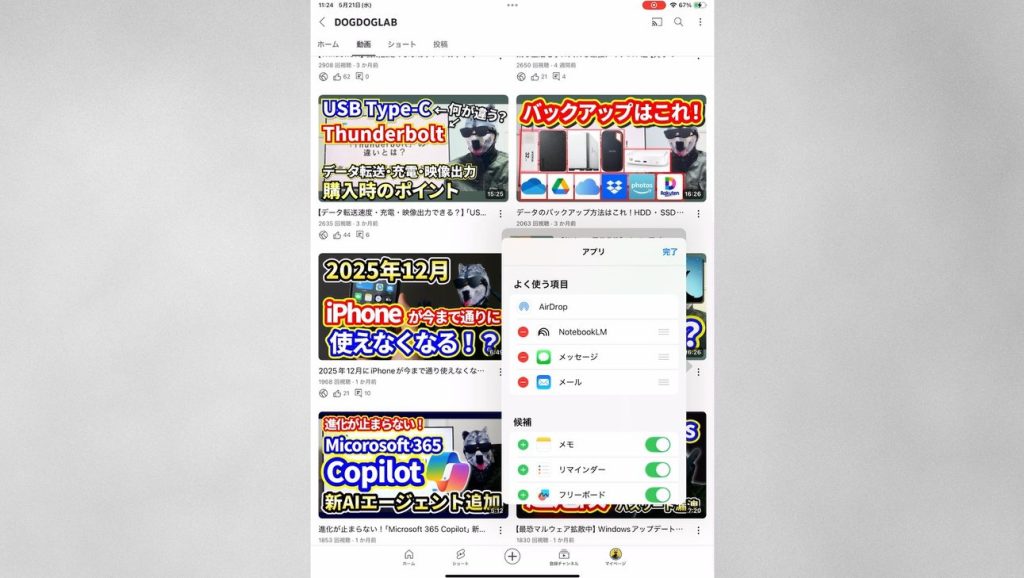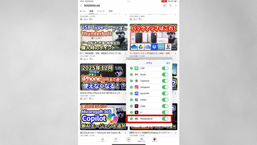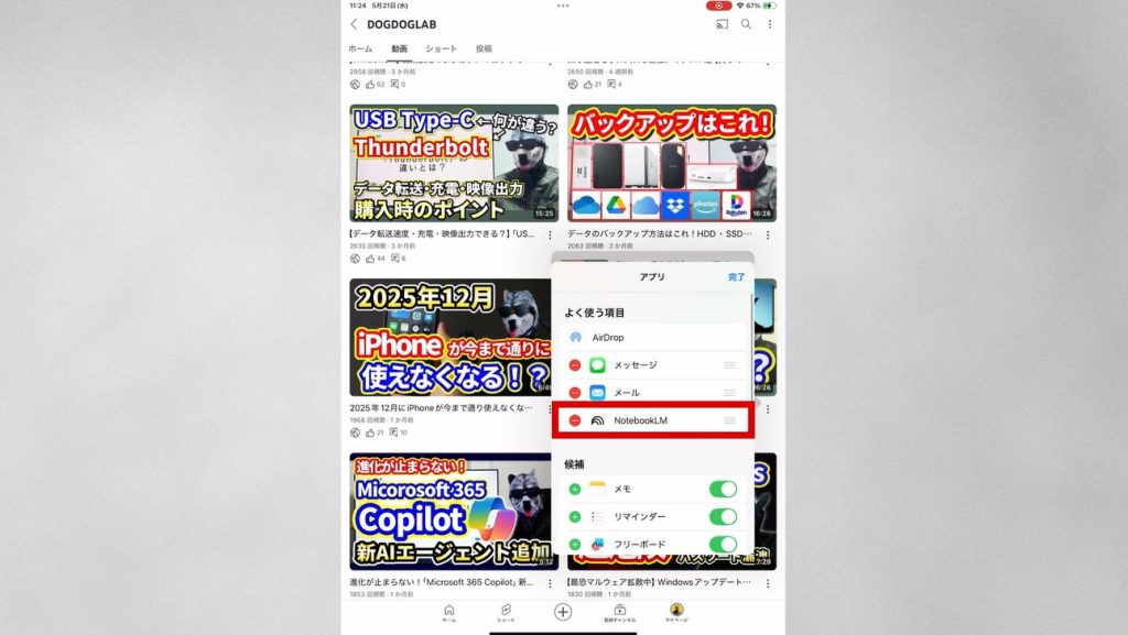 そして、「完了」をタップすると、共有のアプリ一覧の最初の方に「NotebookLM」が表示されるかと思います。