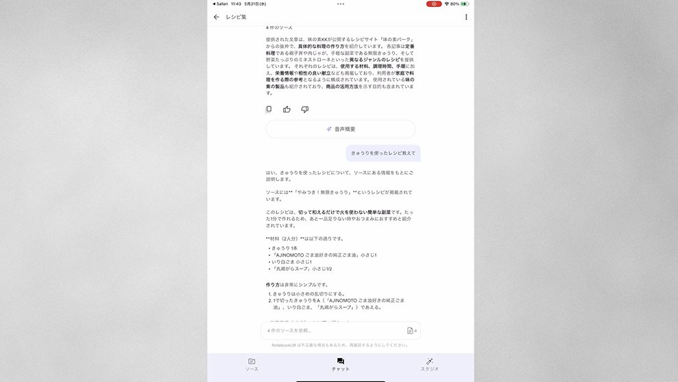 ソースを追加した後に、画面下の「チャット」をタップして移動すると、ソースの要約が表示されます。