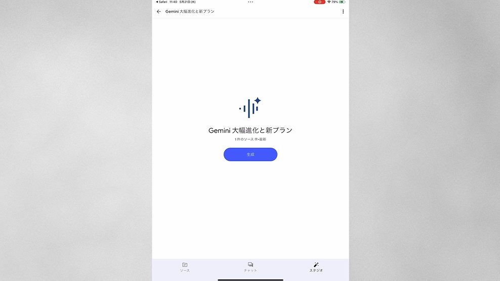 画面下の「チャット」から「音声概要」をタップするか、画面下の「スタジオ」をタップします。