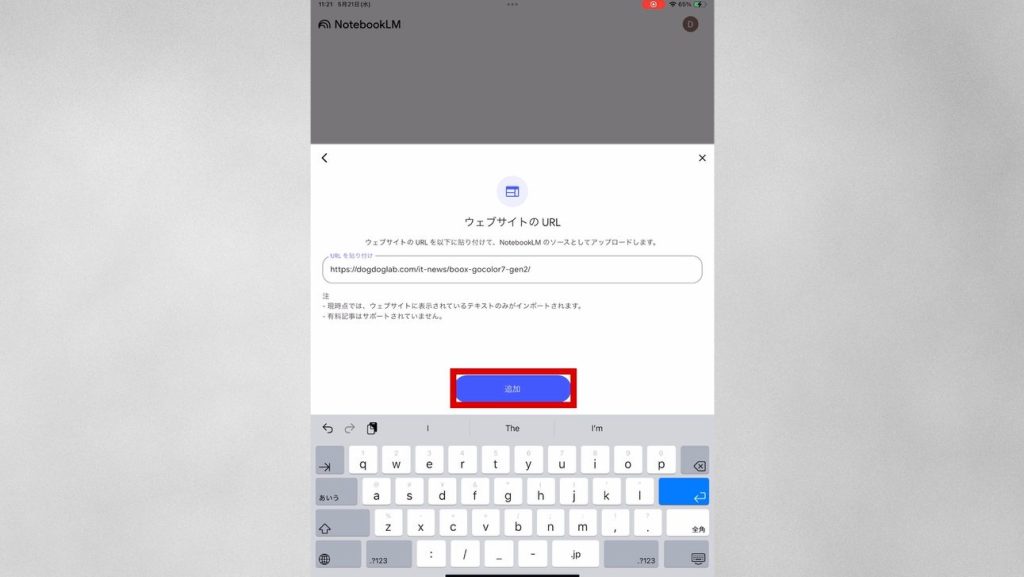 記事のリンクをコピーして、貼り付けて、「追加」をタップします。