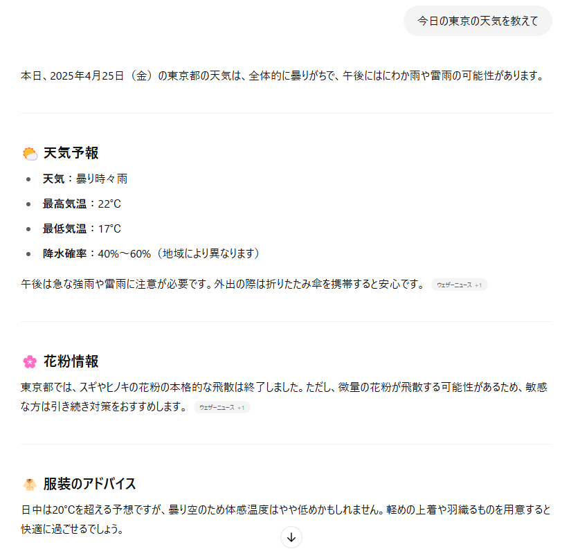 このように「今日の東京の天気を教えて」と言うと、天気を検索して教えてくれます。