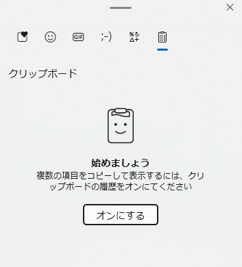 「Win+V」を押したときに、クリップボード履歴がオンになっていない場合は、「オンにする」を押してください。