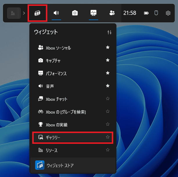 「Win+G」を押して、「ウィジェット」メニューの「ギャラリー」を選択することでも録画内容を確認できます。