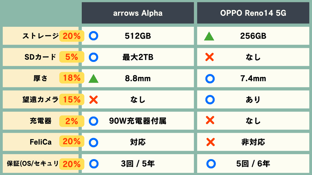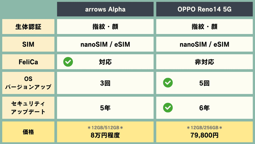 【スマホ比較】バランス最強「arrows Alpha」vs望遠カメラ独特見た目「OPPO Reno14 5G」【8万円前後(予定)】