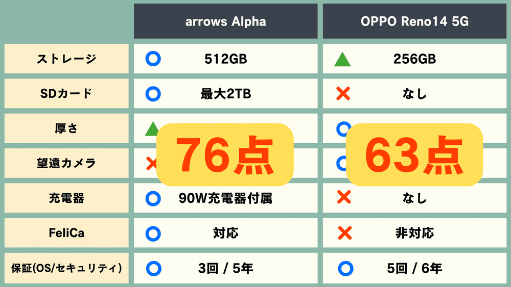 「arrows Alpha」が76点、「OPPO Reno14 5G」が63点になります。