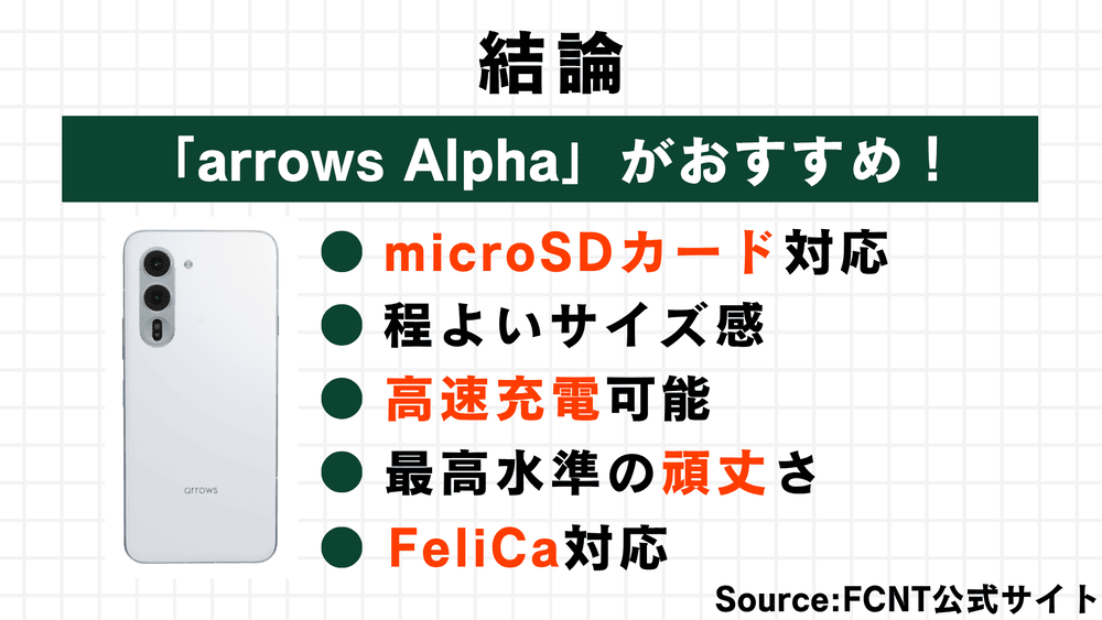 microSDカードに対応していたり、FeliCaに対応していたりと、総合的にバランスの良い、「arrows Alpha」がおすすめになります!