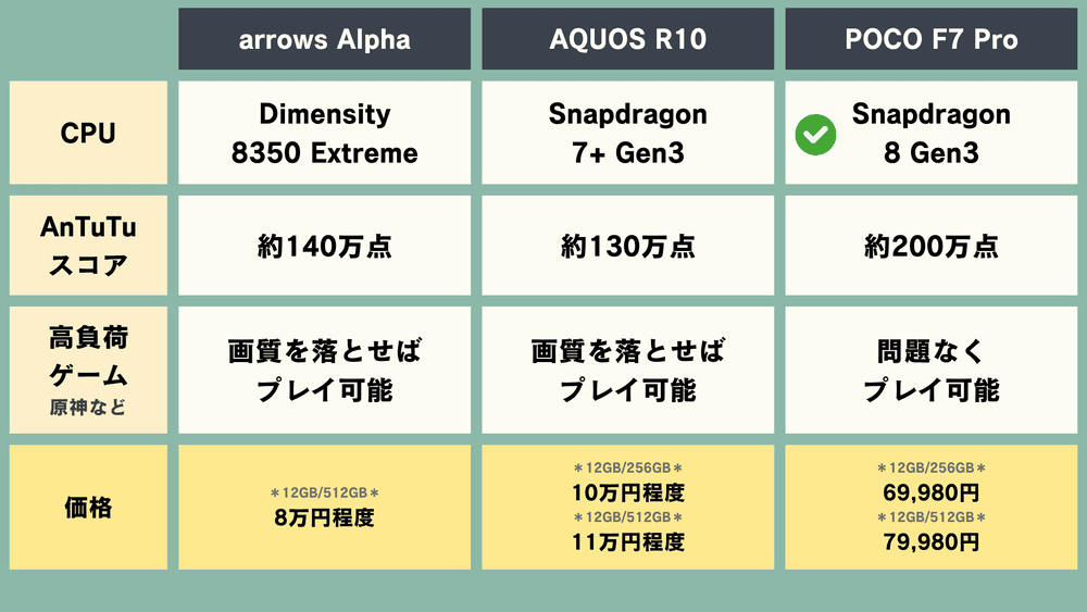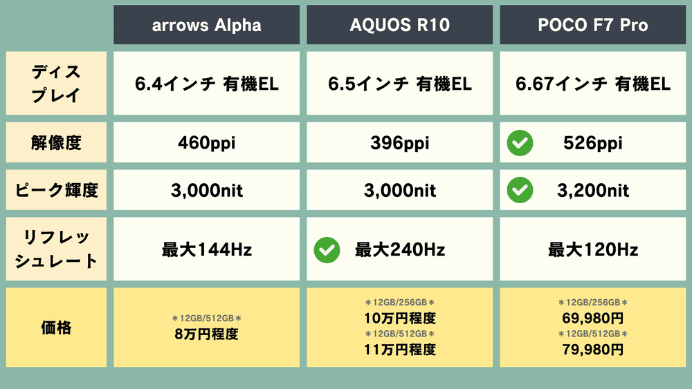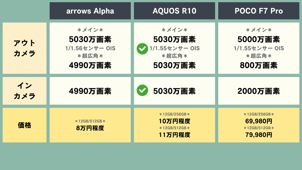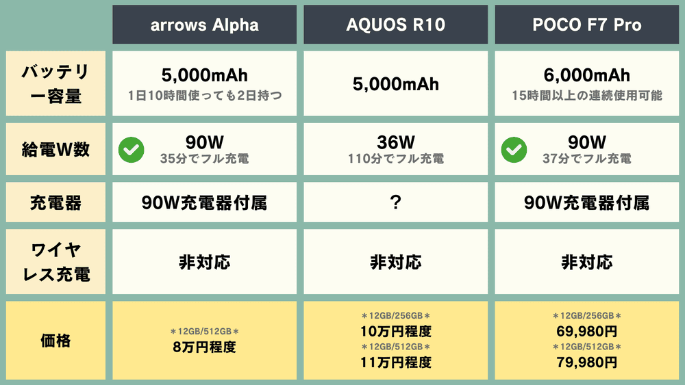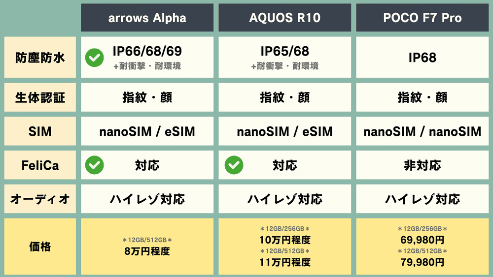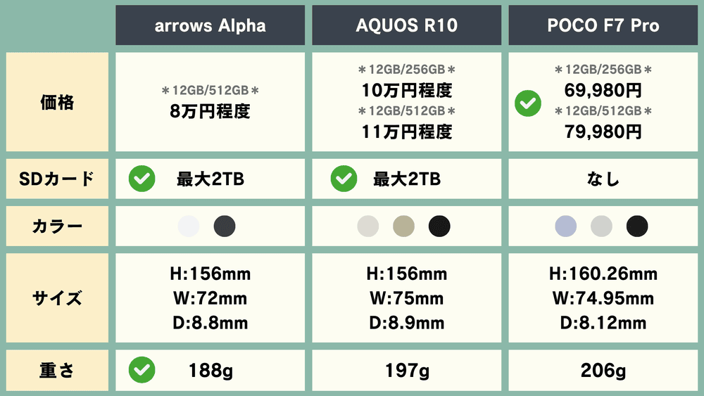 【スマホ比較】「arrows Alpha」vs「AQUOS R10」vs「POCO F7 Pro」どれが良い?【国産スマホ・中華スマホ】