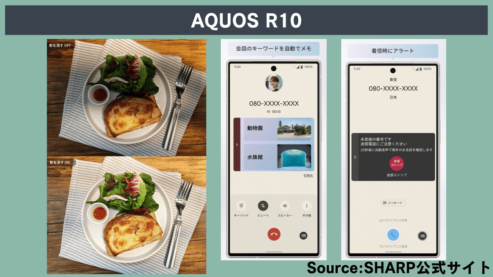 「AQUOS」は、撮影時に気になる影をAIが判定して削除してくれる、影除去機能や、