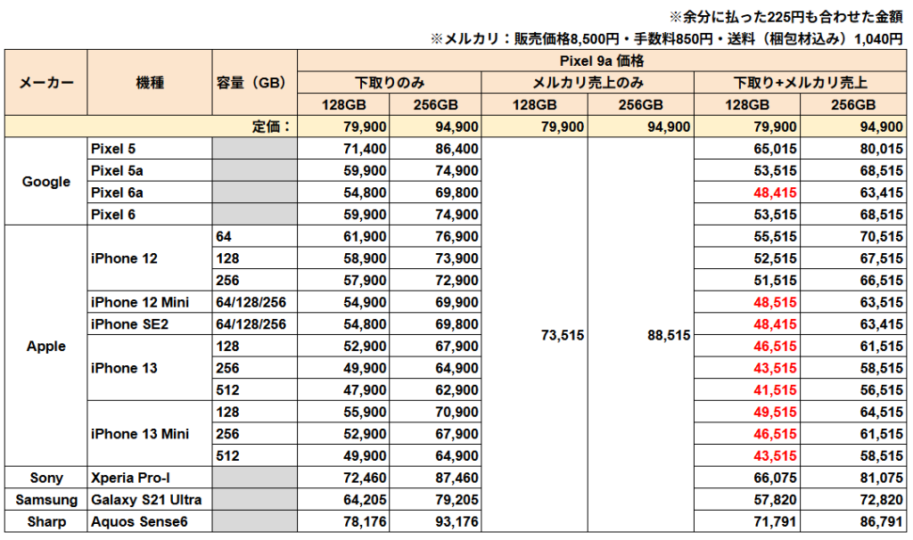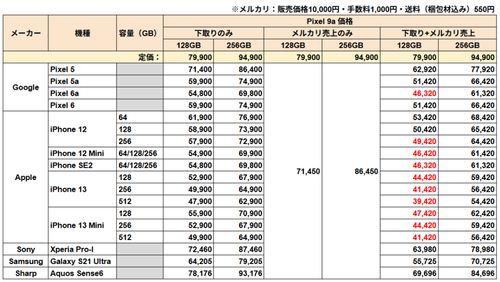 販売手数料や送料を考慮して、「Pixel 9a」がどれぐらいの価格になるかまとめるとこのようになります。