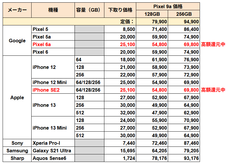 「Pixel 6a」と「iPhone SE2」は高額還元中で、25,100円引きになります。