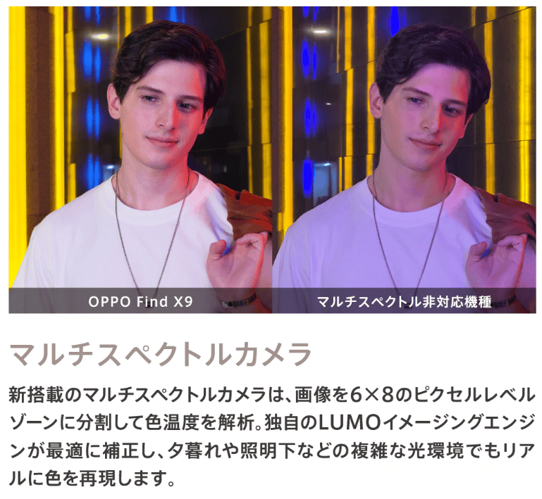 また、「OPPO Find X9」は、3つのカメラに加えて、マルチスペクトルカメラというものも搭載しています。