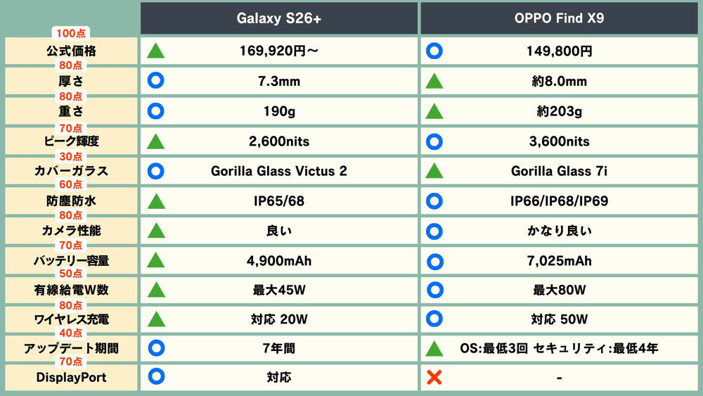 〇を1点、△を0.5点、✕を0点とすると、「Galaxy S26+」が69点、「OPPO Find X9」が77点になりました。