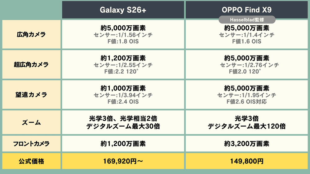 「Galaxy S26+」vs「OPPO Find X9」スペック比較【androidスマホ】