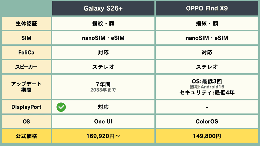 OSは、「Galaxy S26+」が「One UI」、「OPPO Find X9」が「ColorOS」となっています。