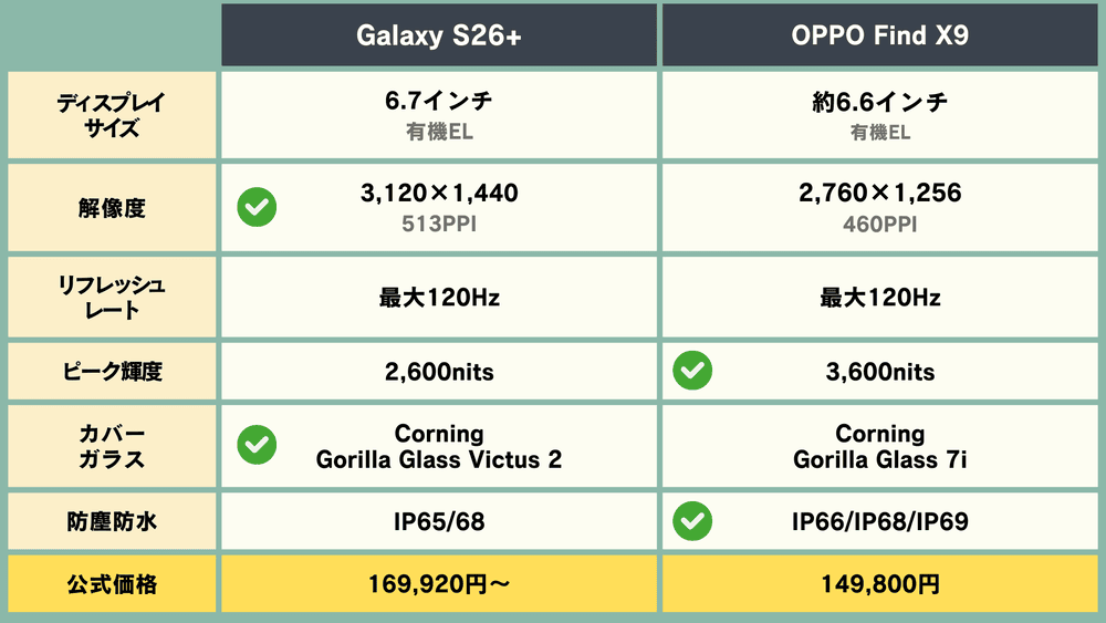 防塵防水性能は、「Galaxy S26+」がIP65・68対応、「OPPO Find X9」がIP66・68・69対応。