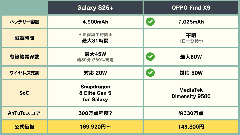 バッテリー容量は、「Galaxy S26+」が4,900mAh、「OPPO Find X9」が7,025mAh。