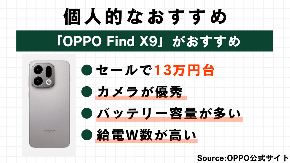 そのため、「OPPO Find X9」がおすすめですね。