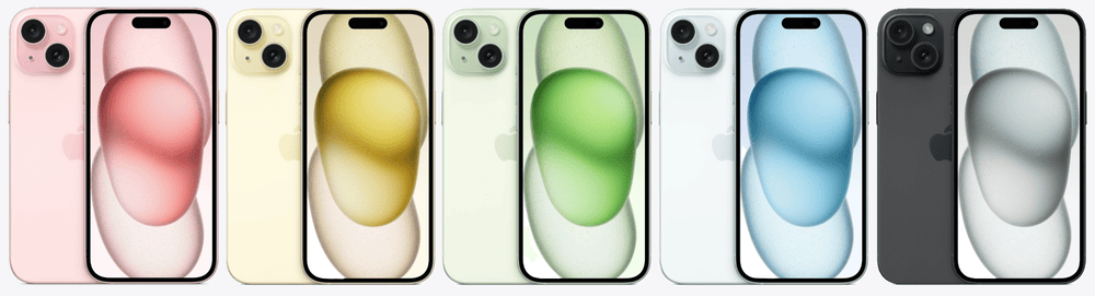 「iPhone 15」が、ピンク、イエロー、グリーン、ブルー、ブラックとなっています。