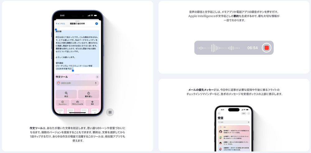 Apple Intelligenceでは、作文ツール、文字起こしや要約、優先メッセージの表示など、様々なAI機能が利用できます。
