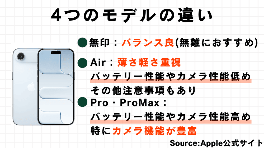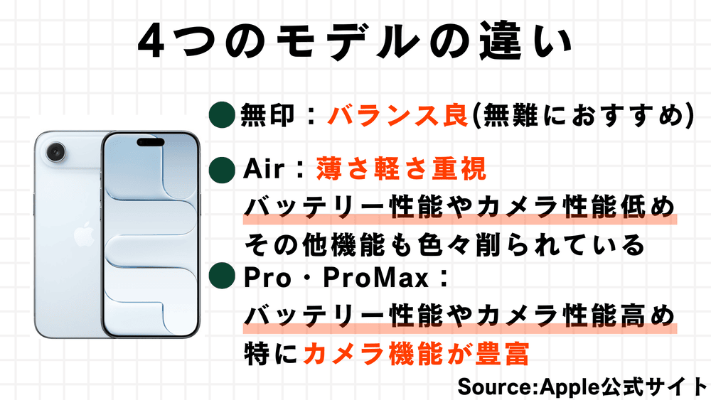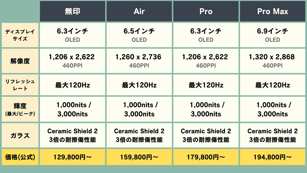 スマホの頭脳にあたるSoCは、「無印」「Air」「Pro」と「Pro Max」の順に性能が良くなっています
