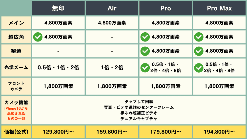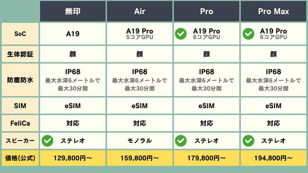 注意してほしいのは、「Air」と「Pro」「Pro Max」は同じA19 Proというチップかと思いきや、