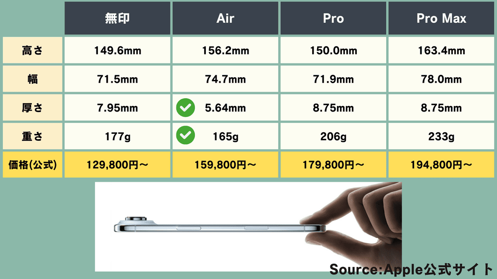 厚さは、「Air」<「無印」<「Pro」と「Pro Max」
