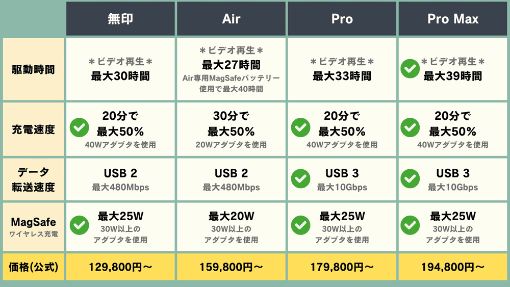 「Pro Max」が一番長く、iPhone史上最長の、最大39時間となっています。