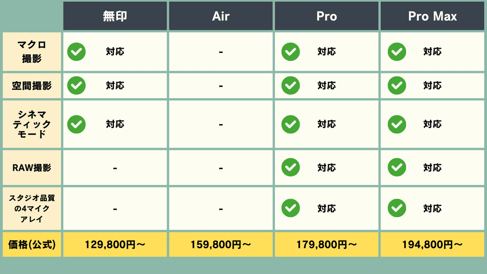また、「Pro」と「Pro Max」は、カメラ機能が充実しており、