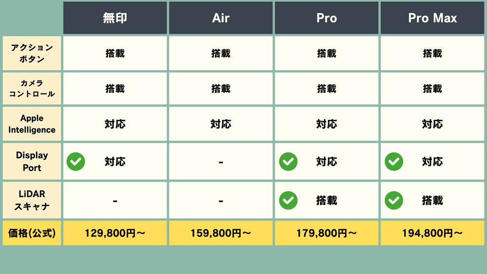 「無印」「Pro」「Pro Max」には搭載されていますが、「Air」には搭載されていません