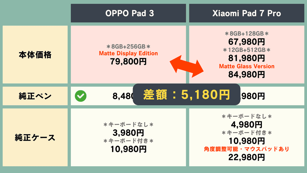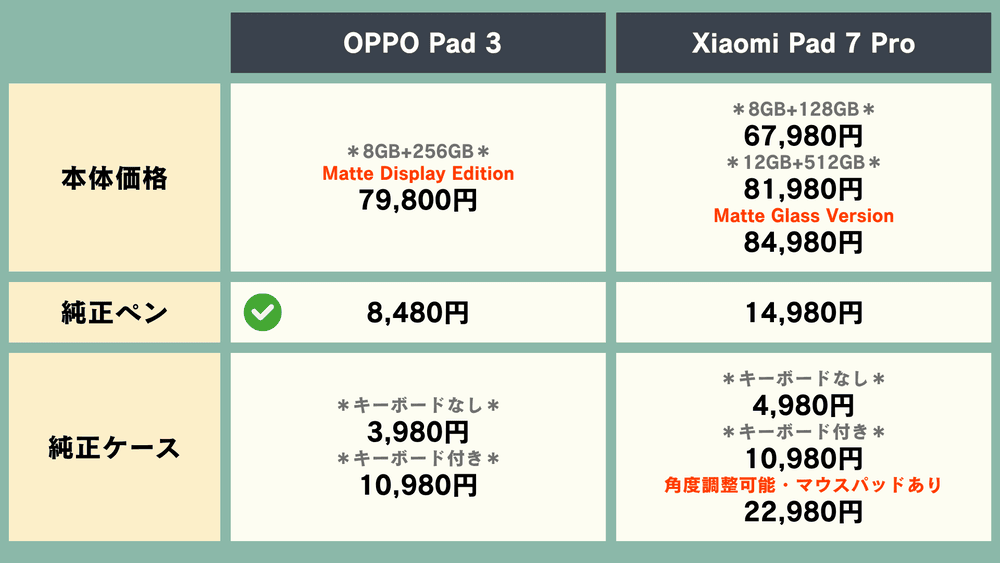 そのため、性能差が気にならないかつ、純正のペンとケースが欲しい場合は、「OPPO Pad 3」のセットを選ぶのもアリだと思いますよ。