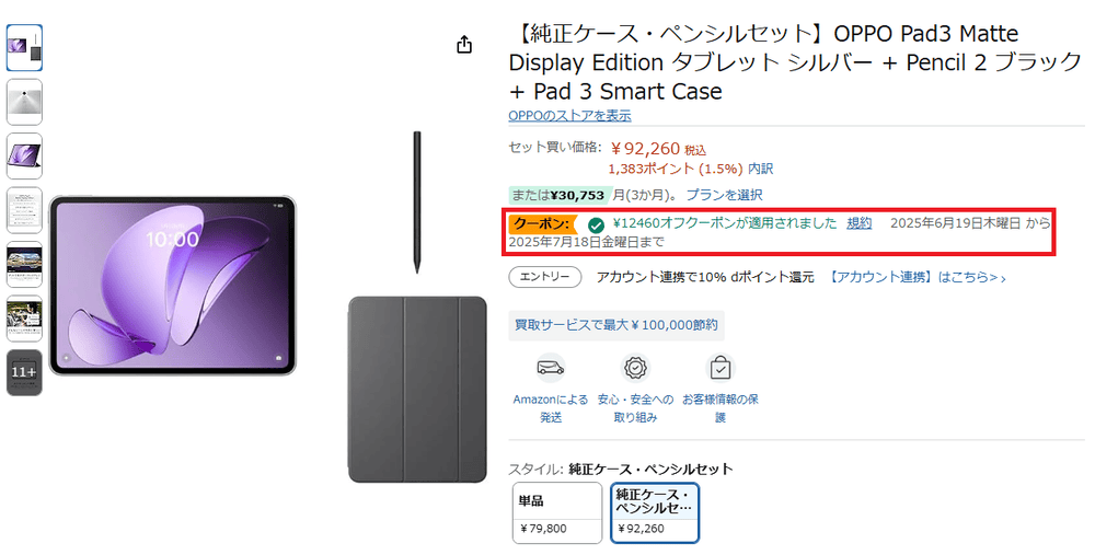 ただ、「OPPO Pad 3」は、amazonで、ペンとケース付きのセットがお得に販売されています。