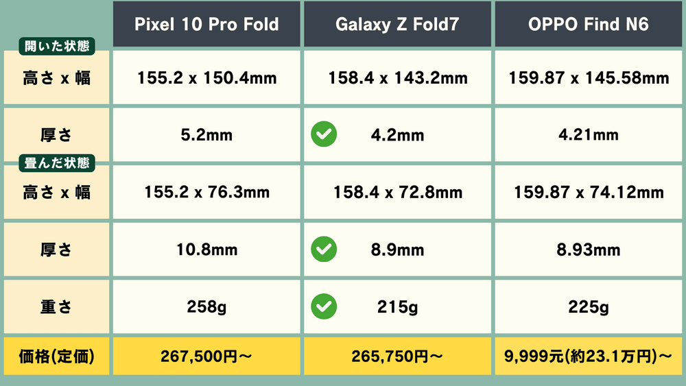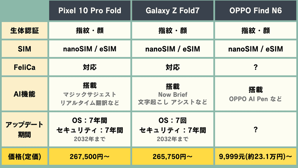 【折りたたみスマホ】「OPPO Find N6」vs「Galaxy Z Fold7」vs「Pixel 10 Pro Fold」スペック比較